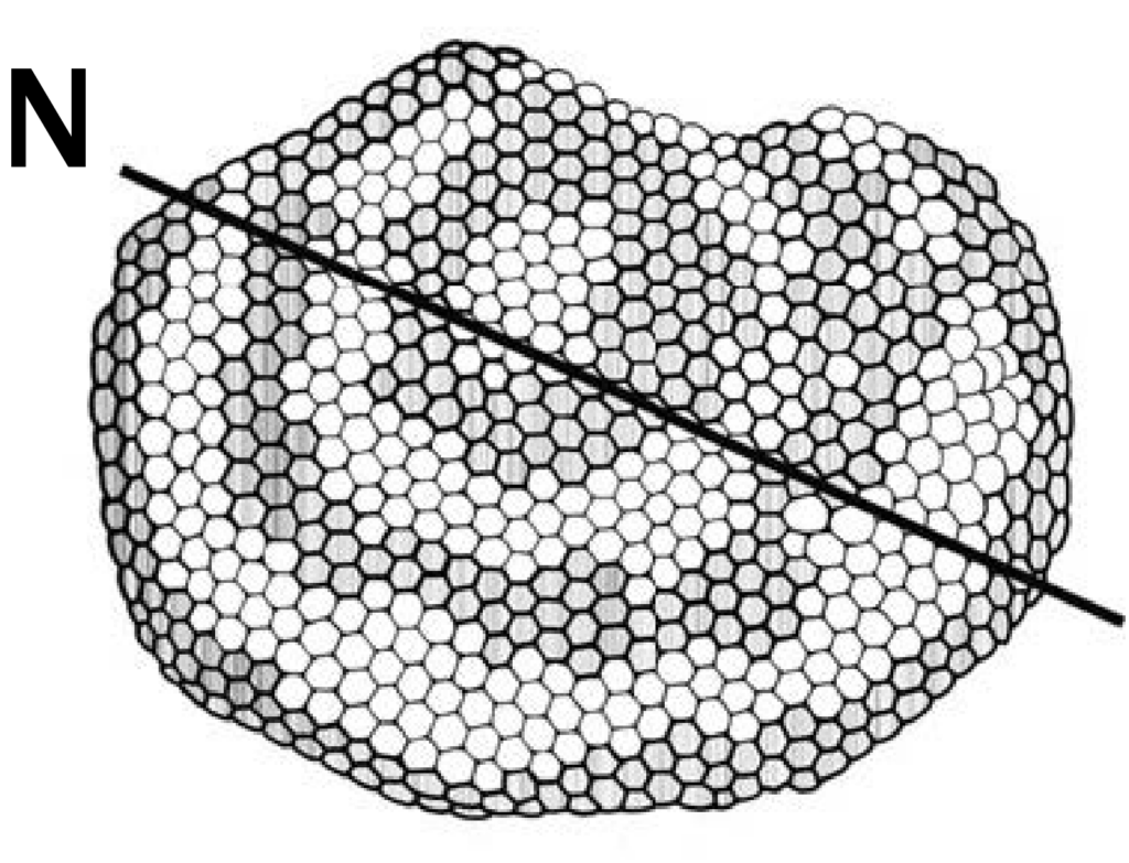 Op basis van n = X metingen leidden Rome en collega's het volgende kwadratische verband af tussen het aantal cellen N langs de langste diagonaal van de grootste raat van een nest (hier de hoofddiagonaal genoemd) en het totaal aantal hoornaars H dat een nest geproduceerd heeft tot dan toe.